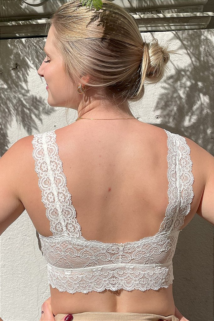 Frente - confeccionada em renda e dupla camada de microfibra, com abertura para bojo removível sem enchimento.